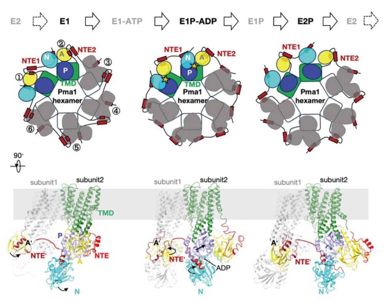 该项研究首次提出了Pma1以协同方式运作的分子模型,指出“域交换”NTE在调控质子泵活性中的重要作用,为解析真菌质子泵的能量转换机制提供了重要线索,并为抗真菌药物筛选与优化提供了新的位点和结构基础(图2)。
