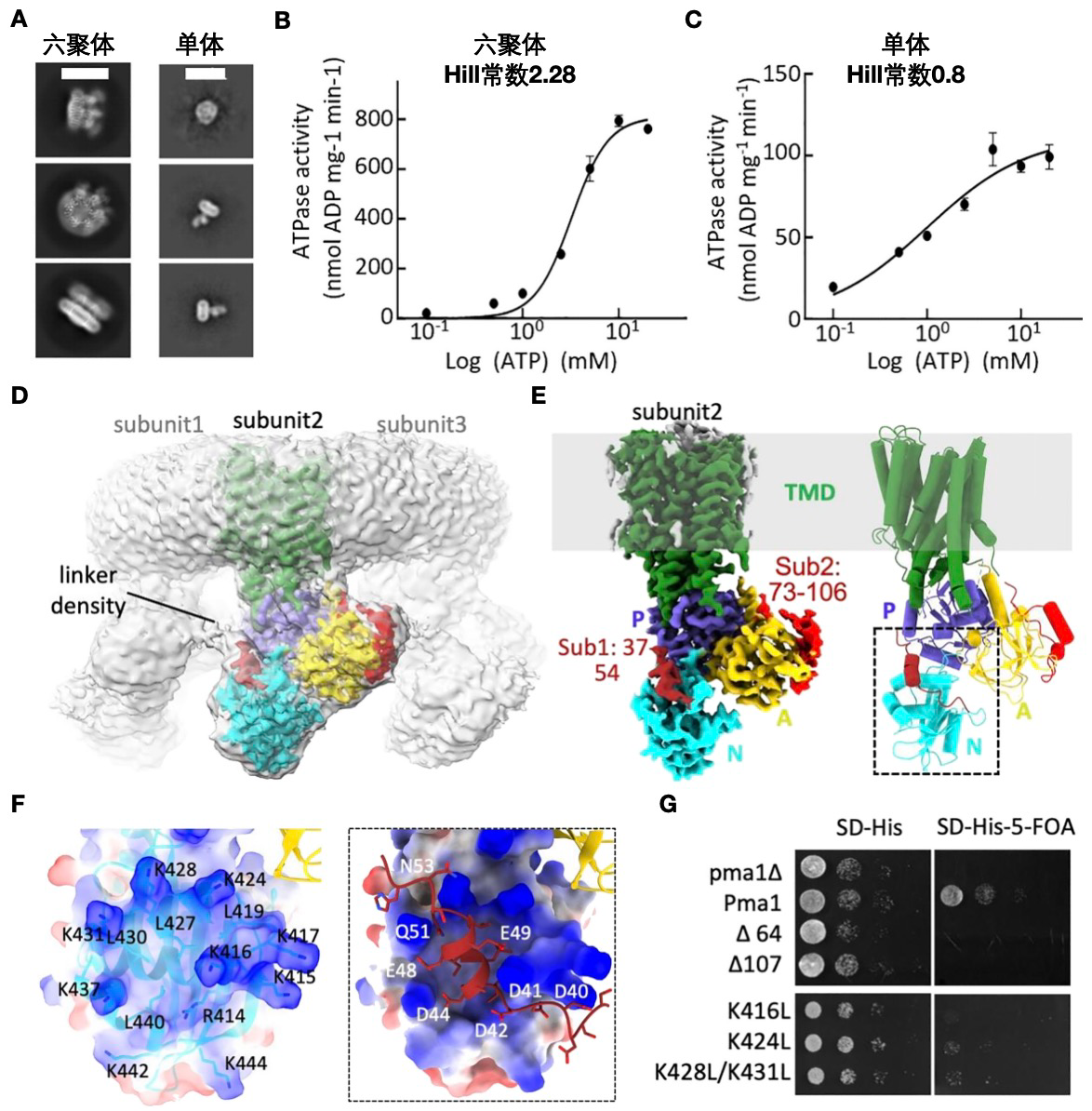 质膜质子ATP酶(Pma1)是真菌细胞膜上丰度最高的蛋白,也是最主要的ATP消耗者,对真菌细胞至关重要。Pma1属于P3A型ATPase,在低pH条件下利用ATP水解磷酸化提供能量来驱动H+从胞内向胞外主动运输,从而保持胞质pH稳定,并维持细胞膜电势,为营养物质跨膜运输提供能量。质膜H+-ATPase不存在于哺乳动物细胞,是热门的广谱抗真菌药物研发靶点。与其他P型ATP酶不同,Pma1以六聚体形式存在,但其六聚体功能意义尚不清楚。