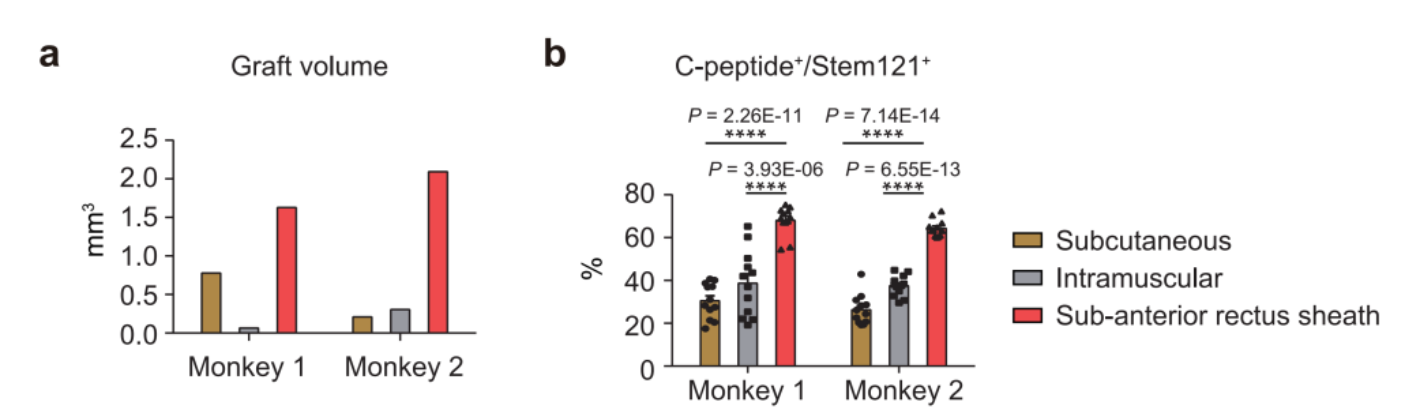 研究人员还证实,hCiPSC-islets移植后,内源胰岛素分泌水平大幅提升,且能够响应血糖浓度变化;与肝脏门静脉移植相比,新移植方案胰岛素标志物(C肽)分泌水平提升5倍以上,其中一只糖尿病猴C肽分泌水平达到了健康人的水平。这个结果表明,未来在人多能干细胞分化胰岛细胞临床移植中,接受腹直肌鞘下移植有望使糖尿病患者完全脱离胰岛素注射,实现1型糖尿病的治愈。