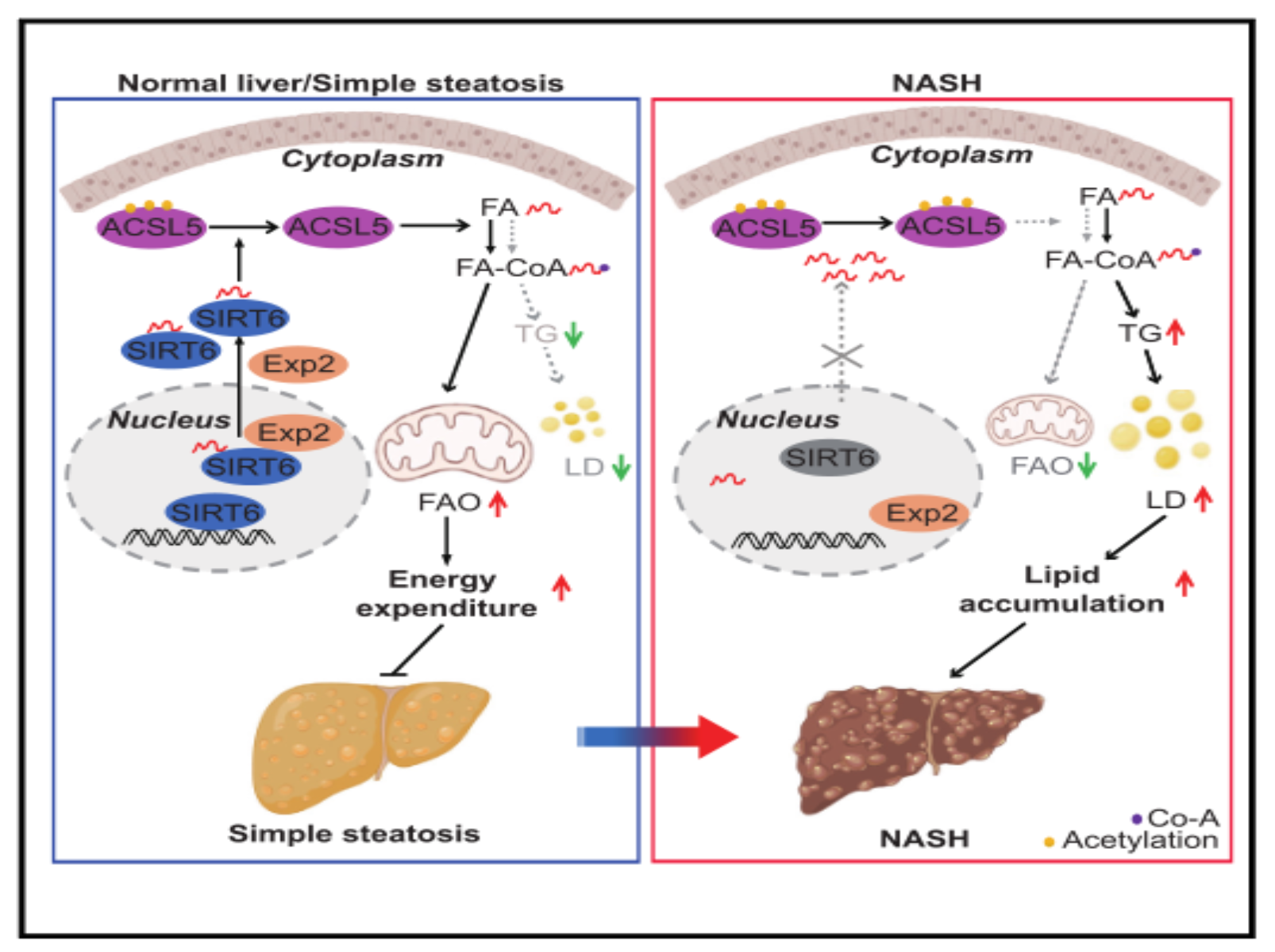 2022年10月7日,朱卫国/杨洋团队在Molecular Cell杂志上在线发表了题为“Cytoplasmic SIRT6-mediated ACSL5 deacetylation impedes nonalcoholic fatty liver disease by facilitating hepatic fatty acid oxidation”的研究论文,揭示了在肝细胞内,棕榈酸刺激组蛋白去乙酰化酶SIRT6从细胞核内转运至细胞浆,细胞浆内的SIRT6通过去乙酰化长链脂酰辅酶A合成酶5(ACSL5)增加其活性,促进脂肪酸氧化,从而提高细胞脂质利用率,最终抵抗NAFLD的进程。
