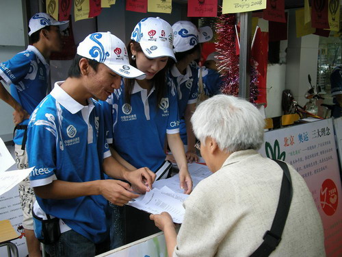7月24日,今天在北医三院志愿者站点服务的是医学实验07级的七名同学以及一名科技大学的同学。 从一大清早,志愿者的小亭子尚未打开,就不断有路人来索要宣传问题,或寻求帮助。由于第二天会卖最后一批的奥运会比赛门票,故而今天前来咨询有关购票适宜的市民格外的多,其中的大多数都是询问剩余奥运场馆门票情况,以及购票点乘车方式。这可难不倒这些志愿者,他们之前已经做好了充分的准备,提早将已经将有关的信息收集整理打印装订,重点内容早已了然于胸。 他们已十分饱满的精神风貌迎接着来自四方的游客,无论问题多么复杂,他们都会尽全力用最短的时间解决。无论问题多么看似基础,他们都以最大的耐心予以解答。或许在学校里,他们还只是人们口中的“有志青年”,但今天他们已经是成熟冷静的志愿者,他们尽己所能,为社会分忧解难,用他们最美丽的微笑,告诉来自五湖四海的朋友,北京欢迎你。 奥运城市志愿者心得 今天是我第一回当奥运志愿者,也是头一回当志愿者,故而在早上去服务站的路上,心中还有几分激动与兴奋。但是没过多久,这几分激动与兴奋,就逐渐消磨干净了。原因就在于几乎每一个来问问题的人,问的都是那么的相近,而且总有一些人带着火气来我们这。 但是一天的工作下来,回头统计一下成绩,居然我们服务了好几百人次,发出了上千张传单,尽管对我们自己来说,我们近似重复了一天相同的工作,所谓提高自身能力,可以说是无从谈起。但如果我们换一个角度来看这件事,我们当奥运志愿者为了什么,或者说志愿二字的意义是什么呢。难道仅仅是我们可以从中学到什么,或者我们可以通过参加志愿者享受一种别样生活么。这样有所图,与打工有什么区别。 我觉得参加志愿者更应该看社会得到了什么,而非我们感觉如何。至少我们服务了几百人次,虽然对我们而言,他们基本一样。但对于每一个她们来说,每一个问题都是有意义的,当然,也包括答案。志愿者的微笑是北京最好的名片,其实路人的微笑是志愿者最大的期待。尽管有时会有个别,但绝大多数人,对我们都是十二分的支持的。志愿者是给别人带来温暖的,同时,我也从路人对奥运的热切期盼感到温暖,感受到万众一心公办奥运的力量。 不得不说,作为一个志愿者,我做的还很少,但毕竟我为许多人排解了一时之困。聚沙方能成塔,希望在每一个做了很少的志愿者积累之上,我们的奥运会盛世空前,无与伦比。